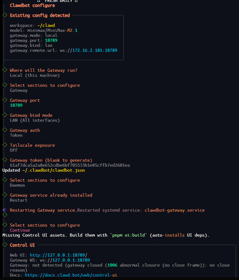 #安装clawdbot curl -fsSL https://clawd.bot/install.sh | bash # npm方法 npm i -g clawdbot --- #设置 clawdbot onboard --install-daemon --- #修改配置 clawdbot configure --- #接入国内大模型 https://cloud.tencent.com/developer/article/2625144 clawdbot config set 'models.providers.minimax' --json '{ "baseUrl": "https://api.minimaxi.com/v1", "apiKey": "sk-cp-7JJv6ZF3leWojiAZ5LTTN_wGSdbKeizdibhbhd-uAalq_-fEohpd3idcynO_guVifHigDpYO1wQyfaTQfzb_t45zHuDncqvdj4P5X5Le_pFWnDYbOHVgPzY", "api": "openai-completions", "models": [ { "id": "MiniMax-M2.1", "name": "MiniMax M2.1" } ] }' --- clawdbot models set minimax/MiniMax-M2.1 --- #设置ip访问 clawdbot configure  --- #配置飞书 ####资料 https://github.com/m1heng/clawdbot-feishu?tab=readme-ov-file#%E4%B8%AD%E6%96%87 --- ####安装 clawdbot plugins install @m1heng-clawd/feishu --- ####详细 https://developer.aliyun.com/article/1709384