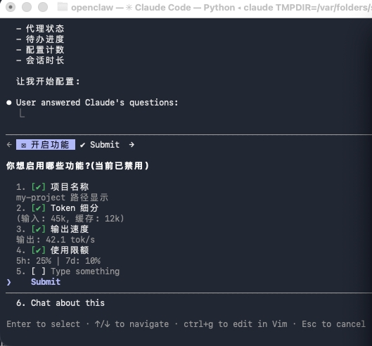 #安装 ####参考文档: https://developer.aliyun.com/article/1710394 --- npm install -g @anthropic-ai/claude-code --- ####手动更新: claude update --- ####验证安装 claude --version --- #设置中文 vim ~/.claude/CLAUDE.md --- ####添加以下内容: # CLAUDE.md 请始终使用简体中文与我对话。 --- #安装cc-switch https://github.com/farion1231/cc-switch/releases/tag/v3.12.1 --- ### Mac --- brew tap farion1231/ccswitch brew install --cask cc-switch --- brew upgrade --cask cc-switch --- ####注意:Mac安装后,需要在系统设置--隐私与安全中设置“仍要打开...” --- ### Linux wget https://github.com/farion1231/cc-switch/releases/download/v3.12.1/CC-Switch-v3.12.1-Linux-x86_64.rpm --- sudo rpm -i CC-Switch-*.rpm or sudo dnf install ./CC-Switch-*.rpm --- #安装claude-hub ####资料: https://zhuanlan.zhihu.com/p/2019884498997756904 --- /plugin marketplace add jarrodwatts/claude-hud /plugin install claude-hud --- ####退出重启claude 小细节:前两步安装完成之后,需要你重启一下Claude Code,然后才能识别第三步的 /claude-hub:setup 指令 --- ####设置 /claude-hud:setup --- ####修改 /claude-hud:configure